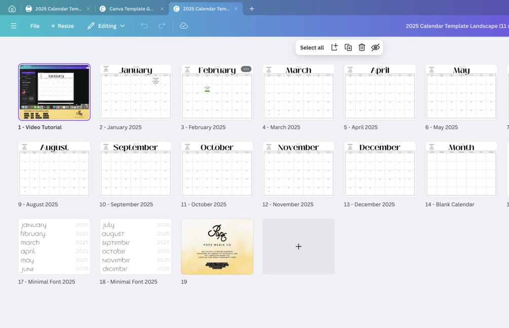 2025 Calendar LANDSCAPE 12-Month Canva Template